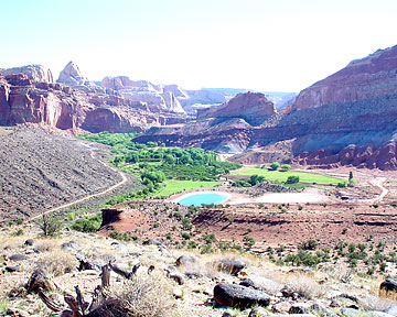 This is the view of the reservoir and campground area at Capitol Reef. The campground is in the trees beyond and slightly left from the reservoir.