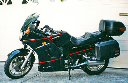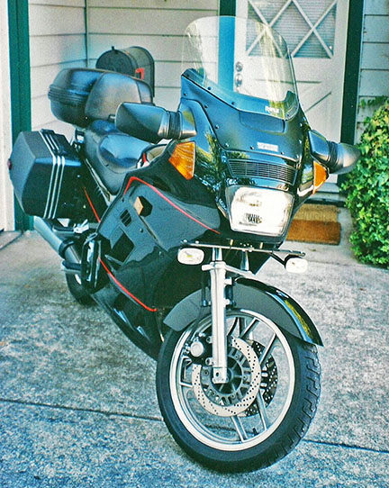 Then one day I saw an article about the Kawasaki Concours in a motorcycle magazine. It said Kawasaki had been building these bikes in Lincoln, Nebraska, since 1987, basically the same model, and it was a good solid sport touring bike at a bargain price. I went to the Kawasaki dealer in San Francisco, which at that time was right next door to the BMW motorcycle dealer, and asked if they had one I could see. They did not, but said they expected to get one in the next week. My girlfriend and I went back that next week. They had the bike on the salesroom floor, but they said they already had a customer who wanted to purchase it but was trying to line up financing. I must have looked a bit disappointed. The salesman said, "If you were to buy the bike, how would you pay for it?" I said, "Cash. I'd write you a check today." The salesman said, "You can have the bike today for cash." For insurance purposes, I had to complete the purchase papers before he let us take it out for a test ride. We rode two-up around a few blocks in the city. I liked it, and affirmed the purchase.