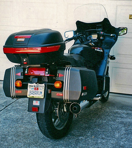 I added a Givi tailpack luggage compartment for more storage. Also, to have more lights on the front of the bike for visibility, I designed some mounting hardware and had a friend who had a machine shop build it from black annodized aluminum. Then I used it to mount two halogen driving lights on the fairing, sufficiently outboard not to interfere with fork rotation for steering or when parked.