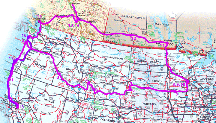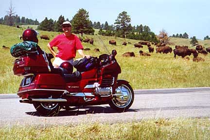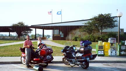 No such luck! The large numbers of bikers headed west to Sturgis had all the rooms. It was hot; over 100 degrees in the afternoon. Elsye was becoming progressively more miserable riding on the back of the Gold Wing. As the sun went down, it began to cool a bit, giving some relief. Even though all rooms were filled, many motels along the route had not posted no-vacancy signs. We held out hope and kept stopping to ask about vacancies until finally, giving up in frustration and fatigue at 2 AM, we stopped to crash at a rest area. We were now in southern Minnesota.