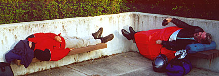 Elyse and Boris had shipped their backpacking equipment home from Jackson. So we made do with our motorcycle clothes and a couple of light blankets I had packed. We got at least a couple hours of restless sleep before awaking Sunday morning just in time to observe a hippie bus (Green Tortoise Line) that had landed in the parking lot. That looked like luxury travel to us.
