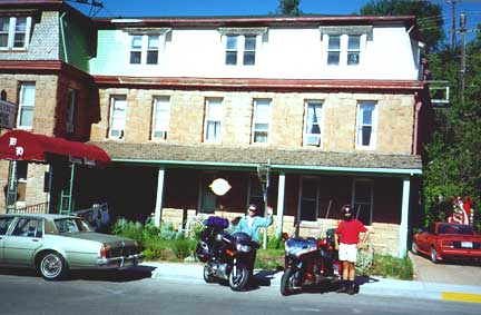 This was the first weekend of bike week, and there wasn't much activity yet in RC, so we rode west to Sturgis where festivities were well under way. We wandered around Sturgis for a couple of hours looking at the bikes, the shops, and the characters, bought a few T-shirts, then headed east on I-90. Stopping for dinner at Wall Drugs in Wall, South Dakota, we called ahead for reservations for the night but soon discovered that all rooms were sold out, at least anywhere we were able to think of calling in South Dakota. So we set out, hoping to simply stumble across an out-of-the-way motel with rooms available.