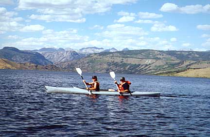 On Thursday, we did a short ride to Pinedale, Wyoming, where we stayed at the Pinedale Lodge on Pinedale Lake. We rented a canoe and kayak and paddled about for a while, rode to the far end of the lake -- about 10 miles and up 3000 feet in elevation -- to look over the Wind River Range where Boris spent five days solo backpacking two years before, then back to the lodge for a good dinner and a good night's rest.