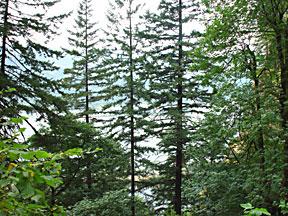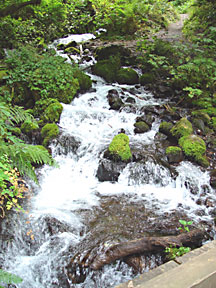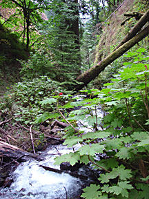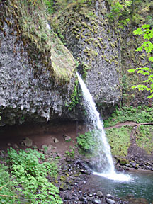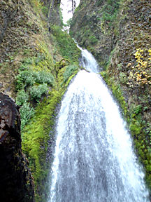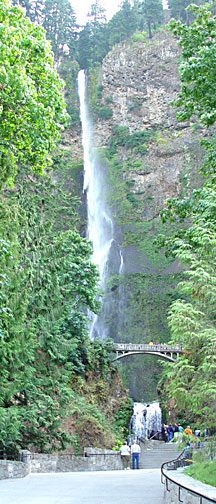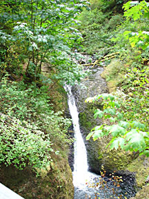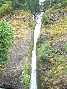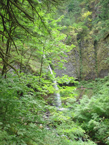 I rode Interstate 84 in Oregon along the south shore of the Columbia River until I reached the Columbia Gorge area. There I left the interstate in favor of old US Highway 30, the Historic Columbia River Highway, a two-laner which parallels I-84 and the Union Pacific Railroad, but is a much more leisurely ride with numerous stopping points at scenic sites and trailheads. On two occasions I parked the bike and hiked a mile or two up into the hills in search of better views of the Gorge and photos of the cascades along the trails. It was a gloomy overcast day, but I managed to get some decent photographs in spite of the light.
